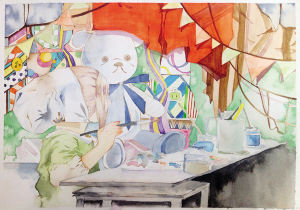 用水彩的技巧,熟练地表现出甜美清新的瞬间。画面中主人公独特的角度,丰富的细节,强对比的红色彩旗,都传达着美好与阳光的味道。