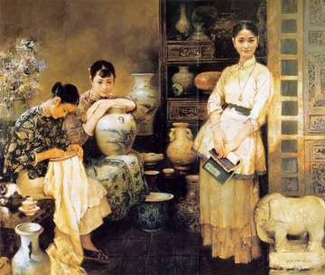 此画是我近年来的主要作品,江南是我的外婆家,童年印象中的外婆及外婆家是美丽的。每个人的童年都是美好的、具体的。对我而言,外婆家的风土人情代表着江南风情,外婆所处的年代代表着江南历史。画面这三人中有外婆,三人的关系是妯娌,三人的组合又反映了一个家庭的生活天地,她们置身于古玩之中典型的江南家居环境……这一切的一切,反映的是江南的情,民族的魂,这不是具体的一幅画,这是对历史、时代的记忆搜索和集中,是江南美在平面上和谐的展示。人物造型之年轻、之完美,色彩素雅而温顺,构图线条之流畅等等的追求,是精心设计,而又尽可能不做作,她是虚拟的外婆家,但又是真实的外婆家。这幅画是既具象,又那么抽象,这就是我想赋予她的艺术感染力。