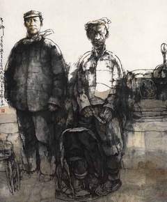 以往我们对于历史画的创作大多是前苏联社会主义现实主义创作模式,即将历史事件进行客观如实的时空再现。如果他要传达自己的这种特别的理念,就不得不摒弃那种再现客观时空的被动手法,历史画的创作必然最终要落实到作品的建构上,创造一种与其内容最为贴切的艺术形式。当自己的感情进入想表现的那个历史事件,对历史的反思,对未来的憧憬。这种激情自然淡化了常规的时空概念。画面上呈现的人体道具、动物,只是想通过标题为观者读画作一个提示,让观者思维进入一种积极主动的思维之中,让这种思维建立在观者的艺术直觉上,而非逻辑概念之中。让人以思考,给人以启迪,能与观者产生共鸣,这对我是一个很大的安慰。  施大畏绘国画 《老乡》 |