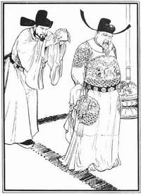 这些资料也有流行的时期和地方性等等问题,我感到更主要的是在应用上和人物关系的问题。进行创作时我首先把重点放在作品中的人物中,资料也得服从人物,如果历史上的服饰和要塑造的人物还不能完全统一,我就改变它来求得统一。例如:《十五贯》是明代故事,明代文官以乌纱帽、圆领衫、束带为常用公服,乌纱翅是不大的。当然周忱、况钟、过于执都照样画也不算错,可我不愿意对他们一视同仁。按品级来讲是另一回事,我的着眼点在于这三个不同的人物,他们的服饰也应该有其性格上的特征。我改动了有十几次(主要是改服饰),最后决定把过于执的乌纱翅变成向上微翘的歪桃子形。我觉得它是过于执酸臭气的点缀,正好和他的傲然神态相对照。况钟的乌纱翅放大成长方形,和京剧里的乌纱翅相同,我觉得对这个严明任重的人物很合适。周忱的乌纱翅改成朝天伸脚的幞头,来增加其煊赫的气势。这样画和"明史与服志"虽有点出入,但是还未跳得太远,所以我也就大胆地这样画了。