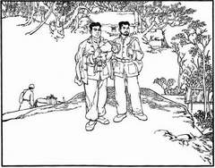 在党和出版社领导的支持下,我们曾经三次到山东去,深入生活和会晤游击英雄们。在南京、济南、临城和陶庄,我们见到了小说里的刘洪、王强、申茂、芳林嫂等人,使我们比较熟悉书中的人物的内心和外形的特征。他们的生动的叙述,不仅丰富了我们许多战斗知识,而且简直是上了生动的阶级教育课,尤其像我们这样学生出身的知识分子,感受更深。我们又到他们战斗过的鲁南地区生活。那里解放后正在恢复建设,遗留下的旧迹已经不多,微山湖畔的农村已经以新的面貌出现。那里的干部和农民都热情而主动的为我们讲解昔日的情景和遗迹,斗争虽然过去好多年了,在他们生动详尽的介绍下,游击英雄们英雄斗争的形象仿佛又重新展现在我们面前。他们渴望着我们能够把微山湖畔的斗争事迹描绘出来。他们的期望,几年来一直是对我们有力的鞭策和鼓舞。  《铁道游击队》选页 |