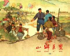 从《山乡巨变》这个作品来看,作者在形式风格的探索上,已有了门径。无论在线条的运用、构图布局的处理都予人清晰明快、干净利落、面目焕然一新的总感觉。在线条的运用上,作者曾经下过一番苦功,像《清明上河图》等一些优秀作品是放在案头经常细细揣摩的。山石的表现上,尽量采用了明、清版画中的皴法,对各种树木的描绘,一方面借鉴了传统的对树的枝干和各种夹叶的勾描,又考虑连环画篇幅多,在表现上要有概括地要求写实的特点,而有所去取。在大的景色和气氛渲染上,作者同样用各种线的组织,结合构图章法,处理得疏密相间、层次分明。在第84、112这两幅中,作者运用线的组织,还表现了晨曦朝雾、夕阳斜照那种轻纱似的空气感,为画中人和读者都带来了清醒爽朗的气息,达到了写人、写事、写情又写景的境界。对于人物的勾描虽略逊于景的描绘,但也做到了写形写神的要求,譬如对于人物面部的刻划,作者虚心的学习了《铁道游击队》作者对人物面部表现的长处,达到较好的效果。整个作品的构图处理上,比较多的采用中国传统绘画中高远的章法,从平易中求变化,减少和避免了画面支离破碎和人物形象不完整的缺陷。据作者自己说,这样处理在创作上要吃力些,但可以更多的来表现画面中的内容,并且也可能更适合于我国读者、特别是连环画读者的欣赏习惯。我认为这是有道理的。从作品来看,近景、特写、低视线少了后,画面给人的效果是完整全面丰富、层次明快、交待清楚,并且由于人物刻划的成功、主题集中突出,加上构图角度上的调节,画面也没有什么单调枯燥的感觉。