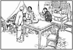 者对亭面糊盛佑亭的塑造,我觉得应该说是最令人可爱也是更为成功的一个。首先在外形上,作者画出了一个湖南老农的典型,包头布下可亲的脸上,眯着一双眼,上弯的嘴角经常堆着满意的微笑,这位要走合作化道路,而对现实生活中充满着斗争不大关心,在许多场合下突出了面面糊糊的性格特征。在60幅里,当大家发现他溜到隔壁屋里睡大觉时,那种手足无措嗫嚅憨笑的窘态,是颇能表现面糊的性格的。刘雨生恰和谢庆元形成一个鲜明强烈的对比。刘的一对近视眼与谢的满脸络腮胡子的区别,同样表达了一人老诚沉着一个骄傲好表现的不同气质。比如27幅,谢庆元在和邓秀梅第一次见面时,那种毫不在意,在他看来邓只不过是一个小姑娘的冷漠态度,是准确生动的。