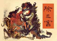 在其风格逐步确立的过程中仍孜孜以求不停地探索着,先后创作了《 秦始皇》、《 那拉氏》、《蔡文姬》等一大批优秀的作品。其中,《逼上梁山》获全国连评二等奖,彩色水墨连环画《 陈胜、吴广》在日本东京获奖。同一题材的黑白描《 大泽烈火》是这一时期的代表作,作者气势磅礴的大手笔将两千多年前陈胜、吴广起义这一历史事件,极好地浓缩再现于这小小的画面中,使人领略到中国历史和古代劳动人民的伟大。  《除三害》封面 |