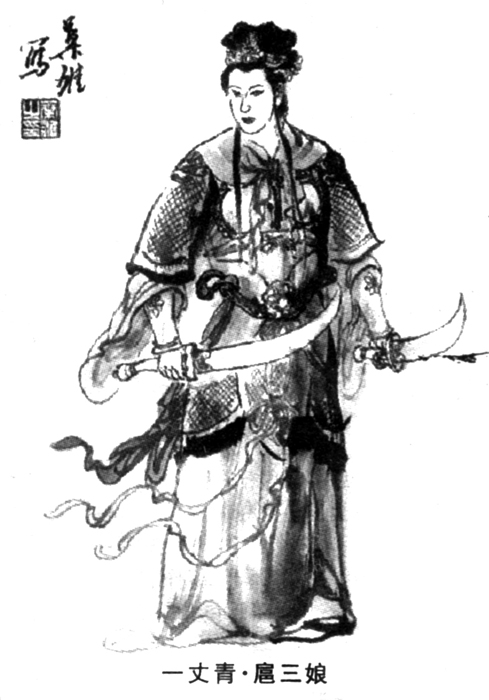 明刻本陈洪绶的《水浒叶子》流传不多,李一氓曾有一本,捐献了,国家深藏自然好。顾炳鑫也藏有一本,前页有程十发书此刻本收藏的经过。早些年,刻本没有时下珍贵,我读过珍本,原稿清逸,明人的艺术承宋的高古、简朴。后来一家出版社征得顾炳鑫同意出了普及本。我所以要评说,就是今人再创作《水浒》人物百图,一是不能低估普及的作用,二是珍本的创作神韵仍然是借鉴的首位。  扈三娘 |