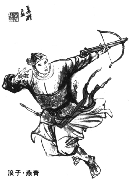 “可以这么说,,水浒一百零八将》是幅中国画,在形式上套用了连环画的‘连’,五六十年代风行的连环画为什么至今魅力还在,不在其形式小而在于雅俗共赏。五六十年代现实主义盛行,民族的、传统的绘画样式得到了光大,作为绣像绘画的民间艺术经过画家的改造成了新连环画。当时强调艺术为工农兵服务,连环画开本小,但创作态度认真,每搞一本连环画都要深入生活,画速写,又参照各种美术形式,使小画本成了非常严肃的大创作。所以,连环画既是一种通俗的读物,又是十分严谨的创作,融合的成份很多,品位高,教授与孩子都喜欢。我的这本《水浒一百零八将》就是表现广泛性,既讲品位,又讲绘画形式美,同样表现通俗性。”叶雄的这段话不只是谈他创作这本书的构思,更是涉及了当前绘画创作所要解决的雅俗合流的问题。在这本书的《简介》中就爱样一段话,“《水浒传》对后世的影响巨大而深远。明人胡应麟在《少室山房笔丛》中说:‘嘉隆间,一巨公案头无他书,仅左置《南华经》,右置《水浒传》各一部。’几百年来,人们对林冲、武松、鲁智深的形象深入人心,家喻户晓。”把叶雄创作的一百零八将图对照上述的言论是十分贴切的。  燕青 |
