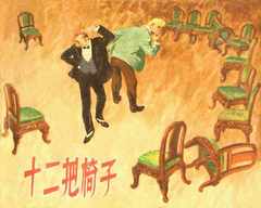 他对凯绥·珂勒惠支版画、木刻连环画的推崇,影响了一大批进步的中国青年画家,一些人借鉴其笔法和精神描绘中国的现实,另外一部分人则担起了介绍国外作品的重任,而这种介绍的形式之一就是将外国人物和作品以连环画的形式表现出来的域外题材连环画。  《十二把椅子》封面 |