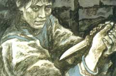 《啊,长城》不是以叙事为主的连环画,而是以抒情见长的连环画。这样的连环画本不多见。更何况是画家自编自绘的重大历史题材连环画呢?!著名连环画家贲庆余先生撰文"铸民族之魂--赵奇连环画艺术散论"(90年第9期《美术》),高度评价《啊,长城》"从内容到形式都典型地代表了赵奇八十年代的连环画创作水平,代表了他的历史意识和现代意识,代表了他对连环画创新的理解和追求。"  《啊,长城》选页 |