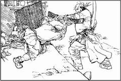 在以后的时间里,弘力先生又相继创作了《雪山魔笛》、《张骞》、《 杨志卖刀》等连环画作品。随着先生的绘画作品日渐减少,美术理论作品日趋增多。《黑白画理》的问世,是先生战略转移一个成功的标志。《中外文学艺术名人肖像(首卷)》直至《古篆释源》这部像耐火砖一般沉厚的学术作品,恰恰是在那不得不搁笔的十几年中孕育而成的。记得有一次,先生长子从国外给先生来信请教篆字,先生在回信中把篆字按古人衣食住行等几大系统进行分类排列指出其中之规律要诀。随意挥洒皆成至文,先生信不虚也。  《杨志卖刀》选页 |