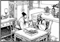 “那么如何看待连环画创作上的写意手法呢?”罗先生认为:“如果连环画的内容是以诗歌、神话为题材的,则不妨用写意手法来描绘故事内容。如果是以现实生活为题材的,则应该用写实手法”。罗先生的回答鲜明地体现了“形式为内容服务”的艺术创作规律。  《尚炯访金星》选页 |