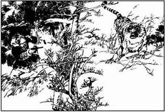 图6,刘邦常到哥哥家吃住,引得嫂嫂不愿意,但又碍于面子不便明说。画面中以刘邦与兄长在内吃饭,嫂嫂在室外借打孩子出气,读者可以想象到那压抑着的刻薄言语。图53,项梁、项羽叔侄因打死仇人,逃走避难。既然避难,总得偷偷摸摸,画面中项梁正从一口井里汲水来喝,项羽仗剑四下睃巡,怒目横眉,右上方一弯月亮,更点出月黑风高,因遑极奔走而干渴异常的夜行人形象,读来真实可信。