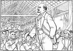人民爱戴顾老,连环画工作者敬重顾老。连环画史上曾有“南顾北刘”的美誉。同是连环画艺术大师,惜刘继卣先生已仙逝,无缘相见;唯顾炳鑫先生鹤发童颜,有幸拜会,怎不令人们心潮起伏难平!连友们蜂拥而上,抢着请顾老在自己的藏书上签名。两架照相机的闪光灯不停地闪烁--历史就在这时不停地回闪着。这是名重一时的“顾派风格”,这是彪炳千古的“红色旋风”: 红岩、 红灯记、 红色的十月、 红色的1918年、 红色的黎明河边和 红色的李连长、小八路、小辫子哥、马特洛索夫……历史在这里定格--这些光与火曾给人以真、善、美,陶冶性情,净化心灵。内容与形式高度和谐的佳作,影响了一代又一代人;环顾左右,会场上崇拜者又几乎是清一色的新一代年轻人,这真耐人寻味:不朽的艺术是跨越时空的。  《列宁在一九一八年》选页 |
