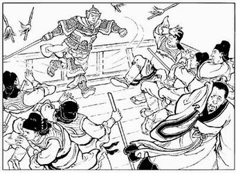 卢汶画《截江夺阿斗》说来还有一个缘故:原来这部故事很多画面是水景和船景,他曾在船上生活过几年,比较熟悉环境,所以创作起来比较得心应手。