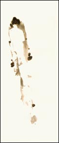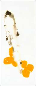二、 用石黄。石黄是粉质颜料,不透明,可以显示葫芦不透明果实的重量 感。不能用藤黄,藤黄是透明体,用后无质感。石黄根据画的效果需要,加少量赭石,增加颜色层次的变化,表示葫芦秋后不同成熟度的层面。用较大的羊毫提笔,两笔或三笔垛成葫芦形态,在长石下部,上下互相成章。