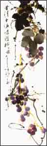 八、初步修整后,再放远处审视。必要时,再作个别调整、点苔,增加一 或两颗葡萄,注意浓淡。然后在大叶中间勾筋,同时要与藤条紧密牵连聚