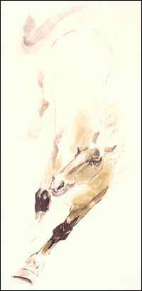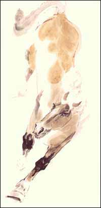 5. 勾画出马的后腿。 6. 用赭石掺入少量淡墨点簇马的斑块,完成画作。